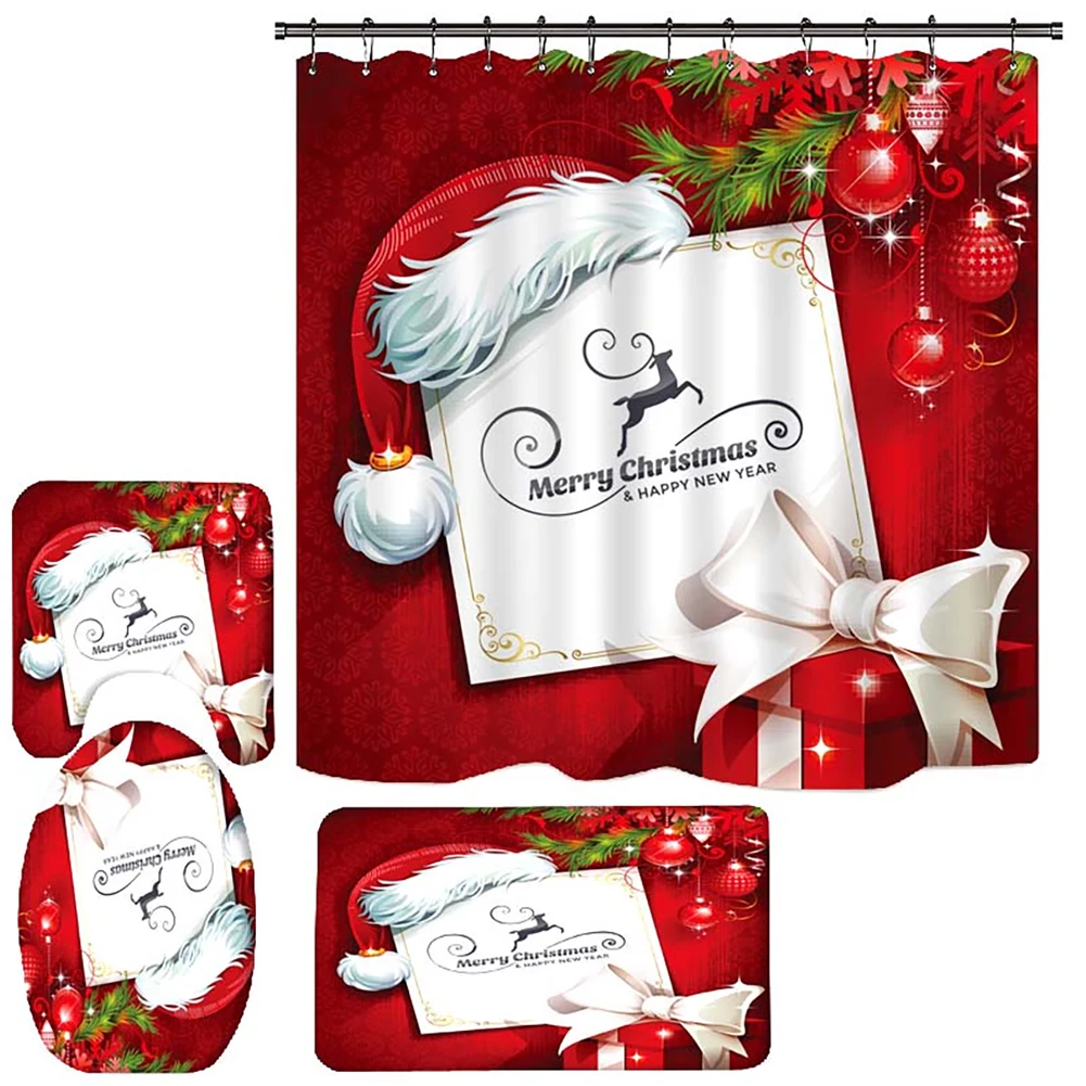4PCS Bathroom Shower Curtain Set Christmas Snowman Santa Claus Printed Waterproof Shower Curtain Toilet Cover Mat Non Slip Rugs