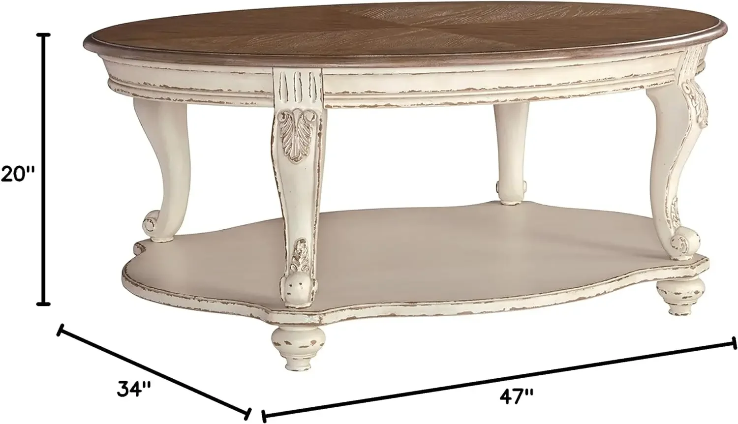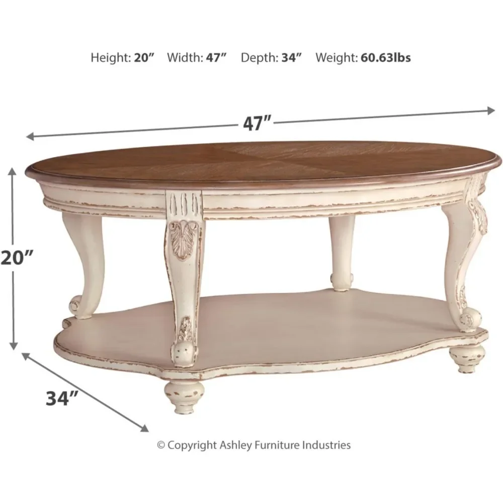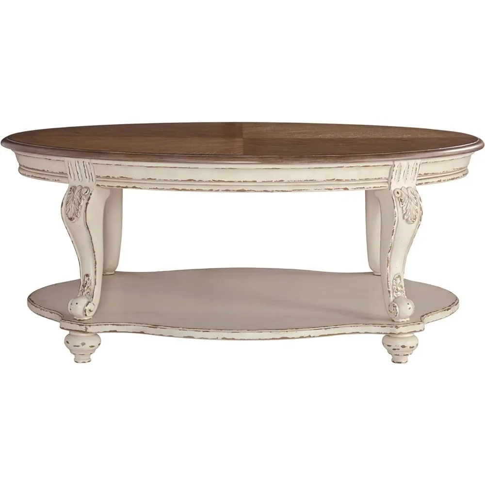 Elevating the art of traditional cottage styling, this oval coffee table is sure to serve you beautifully for years to come. Antiqued two-tone aesthetic blends a chipped white with a distressed wood finished top for added charm. Classic cabriole legs and shapely lower shelf are a lovely twist. Decorative corbels add refinement. With a variety of styles and materials, accent tables can provide storage in a living room or give guests a spot to rest their drinks. They can add subtle drama to your decor by presenting a place for artwork, a lamp or a plant. We have a wide selection of coffee tables, console tables and occasional tables, from rustic farmhouse designs to modern openwork styles. They come in a multitude of sizes, too, so you will find one that fits just where you need it.