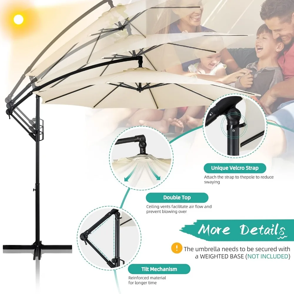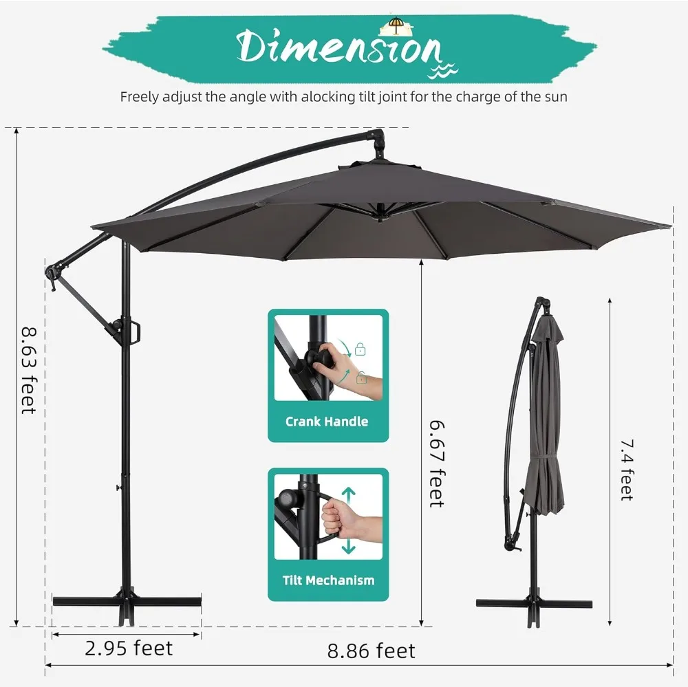Are you still looking for a shading for your outdoor living space? Our Shintenchi patio offset umbrella would be your best choice! The exceptional frame and canopy guarantee years of use. The 95% UV protected and waterproof fabric will keep you always in a comfortable space no matter what the weather is outside. You can always enjoy chatting with your family under the umbrella and keep away from the heat and rain. The angle can be adjusted infinitely according to your different needs. The quick open and close design let it being easily storage. It’s ideal for your home with no doubt. Don’t hesitate to get one now and start your cosy outdoor leisure time! Features: 10FT size providing a large range of shade Convenient tilt device meets variant shading needs Heavy duty frame and upgraded canopy are ready for years of use Velcro strap and ceiling vent for an optimal stability Perfect for your variant outdoor space The weight base is not included